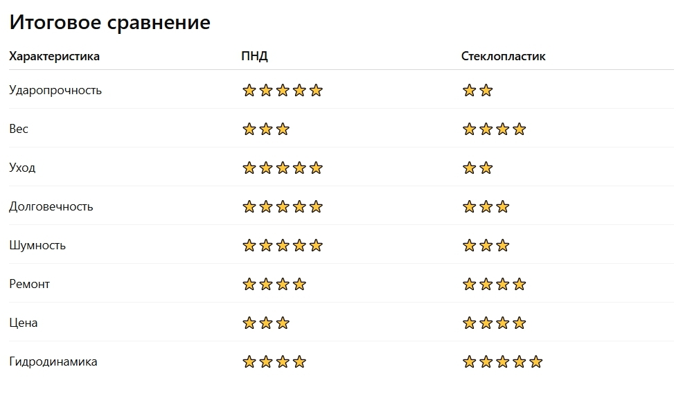 Если вам нужна максимальная прочность, ударостойкость, долговечность и отсутствие ухода, материал ПНД — лучший выбор. Он оптимален для рек, мелководья, северных регионов, сложных условий эксплуатации и утилитарных задач.